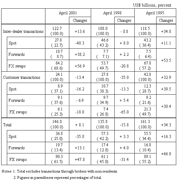 (1) Average daily turnover in the foreign exchange market (excluding cross-border transactions through brokers) in Japan during April 2001 was US$146.8 billion, 8.1 percent higher than the figures in April 1998 at US$135.8 billion.