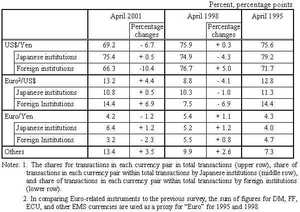 (4) Transactions by Japanese financial institutions decreased from the previous survey, both in the inter-dealer and customer markets, resulting in a 25.5 percent decrease in total. Transactions by foreign financial institutions showed an overall increase of 38.0 percent from the previous survey, as an increase of 50.6 percent in inter-dealer market transactions overweighed the decrease of 14.6 percent in customer market transactions. Thus, the share of total turnover in the foreign exchange market held by Japanese financial institutions fell to 32.5 percent in 2001, compared with 47.1 percent in the previous survey.
