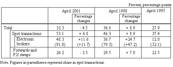 (6) The proportion of transactions through brokers in inter-dealer trading was 32.3 percent, down from the 36.8 percent in 1998. Against the background of increases in transactions through electronic brokers, the share of spot transactions in total foreign exchange market activities increased by 6.8 percentage points. The share of spot transactions through electronic brokers in the total of spot transactions through brokers increased to about 90 percent.