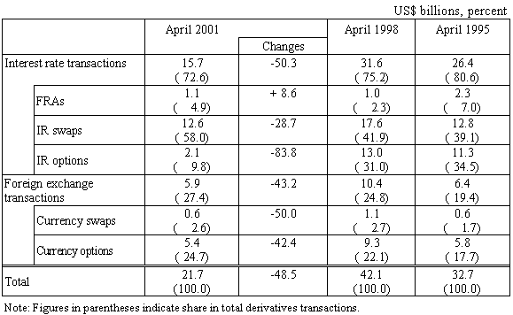 (1) Average daily turnover of derivatives contracts (i.e., interest rate-related and foreign exchange-related derivative contracts) in Japan was US$21.7 billion in April 2001, a decrease of 48.5 percent from the previous survey.
