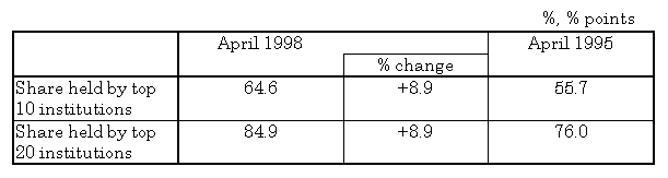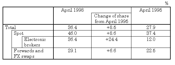 f) Breakdown data by reporting dealers show that 40.8% of total turnover was accounted for by Japanese financial institutions, whereas 59.2% was accounted for by foreign financial institutions operating in Japan. These shares were 57.6% and 42.4% in 1995, respectively.