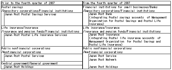 The Japan Post Bank and the Japan Post Insurance have started their business operations in October 2007. The sectoral classification in the Flow of Funds Accounts has been treated as announced in "Treatment of the Japan Post Bank, etc. in the Flow of Funds Accounts" on March 14, 2008.