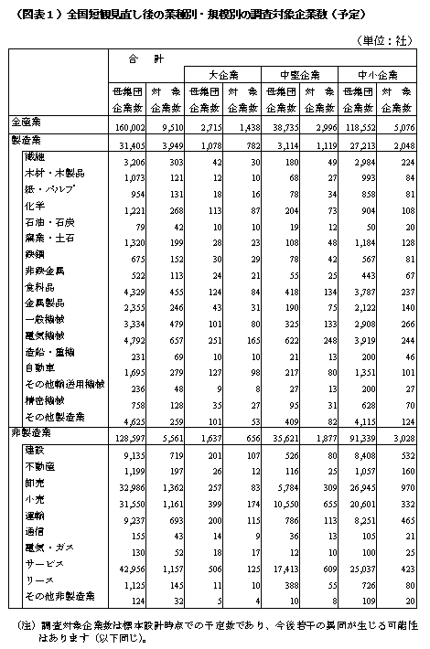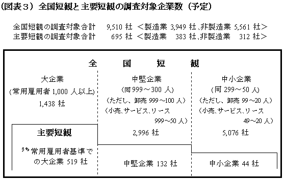 「全国短観」は、5年毎に行なわれる総務庁の「事業所・企業統計調査」のうち常用雇用者50人以上(卸売、小売、サービス、リース業は常用雇用者20人以上)の民間企業(金融業を除く)約16万社を母集団として、その中から調査対象企業を選ぶ標本調査です。