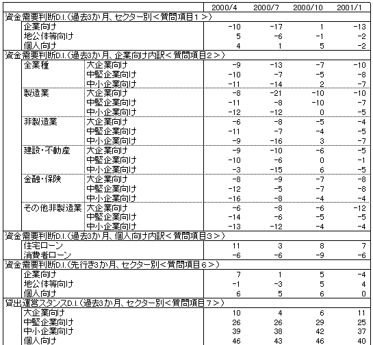 2001年4月調査公表時より、「主要銀行貸出動向アンケート調査」の公表フォーマットを変更し、一部の質問項目について、従来の「平均値」に代えて、回答金融機関の判断を100から−100までの指数で表したもの(「資金需要判断D.I.<ディフュージョン・インデックスの略>」等と呼ぶこととします)を公表することとしました。